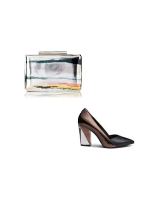 Minaudière argent de L.K. Bennett et escaprins cuivre noir et plexiglass de What For