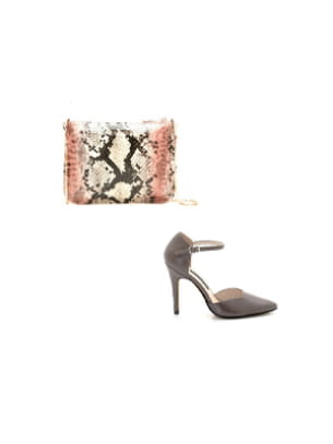 Pochette en cuir façon python de Ted Baker et escarpins  gris en cuir de Laura Clément chez Balsamik
