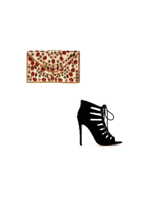 Pochette brodée de Ba&sh et sandales à talons noires d'Asos