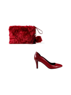 Pochette texture fourrure rouge de Mango et escarpins en cuir bi matière rouges de Bata