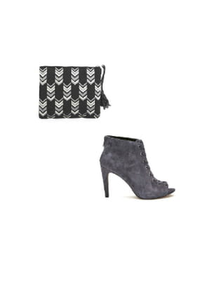 Pochette brodée noire de Bérénice et bottines en daim grises de French Connection