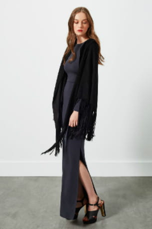 Cape noire à franges et robe longue bleu marine de Miss Selfridge