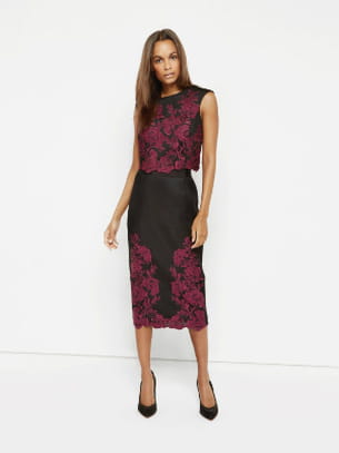 Top court et jupe tube midi, noirs avec fleurs brodées bordeaux de Ted Baker