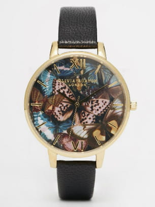 Montre à gros cadran analogique rond imprimé papillon et boîtier doré avec bracelet noir en cuir de Olivia Burton sur Asos