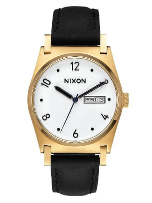 Montre à cadran analogique rond blanc et boîtier doré avec bracelet en cuir noir de Nixon