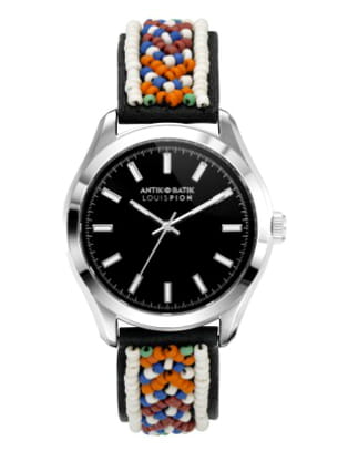 Montre à cadran analogique rond noir et boîtier acier avec bracelet en cuir noir brodé de perles de couleur de Louis Pion X Antik Batik
