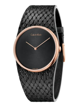 Montre à cadran analogique rond et boîtier or rose avec braceler en cuir noir façon python de Calvin Klein