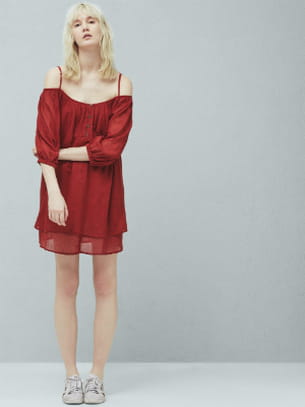 Robe bordeaux en coton avec épaules dénudées et fermeture boutonnée sur le devant de Mango