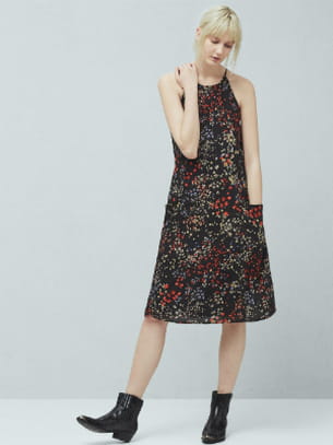 Robe noir fluide avec motifs floraux, emmanchures américaines et noeud à la taille de Mango
