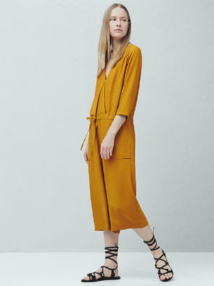 Combi-pantalon en tissu fluide avec col cache-coeur en V, cordon de serrage à la taille et poches plaquées sur les côtés de Mango