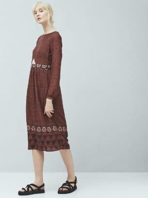 Robe bordeaux en tissu fluide avec motifs ethniques et ouvertures triangulaire sur le devant et au dos de Mango