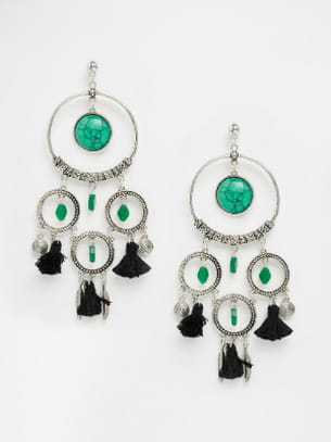 Boucles d'oreilles argentées avec pierres vertes, plumes et franges de Asos