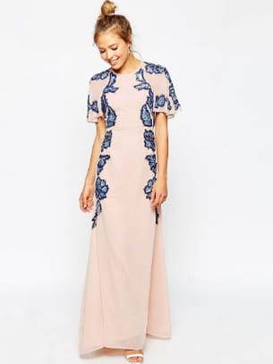 Robe longue nude avec empiècements de sequins bleu en forme de fleurs, manches courtes évasées et dos-nu de Asos