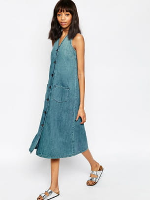 Robe bleu délavé en denim sans manches avec boutons sur le devant de Asos