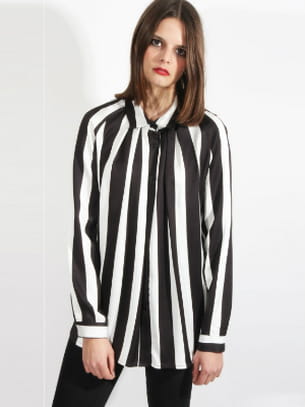 Chemisier noir et blanc avec rayures verticales et plis sur le devant et sur le dos de Les Chats Perchés
