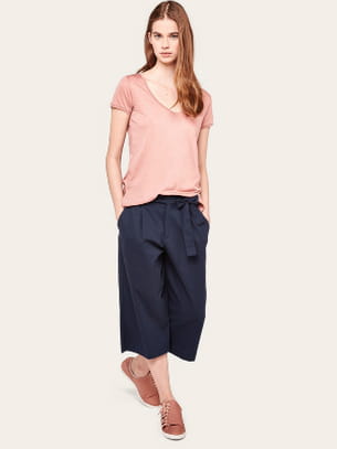 Pantalon bleu en coton court et évasé avec plis sur le devant et ceinture amovible de Comptoir des Cotonniers