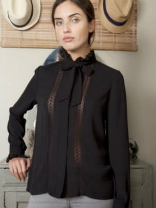 Chemisier noir en coton avec col volanté et bandes en dentelle sur le devant de Harpe