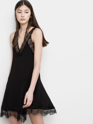 Robe noire en tissu fluide avec décolleté en V et empiècements en dentelle sur les bretelles, au dos et devant de Pull and Bear