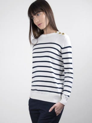 Pull blanc en coton et cachemire avec rayures bleu marine et boutons dorés sur une épaule de Hircus
