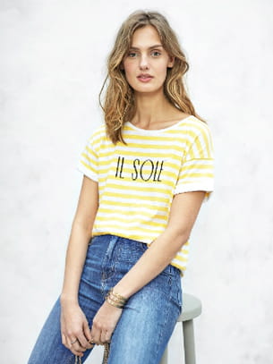 T-shirt écru en coton avec rayures jaunes et inscription de Sézane