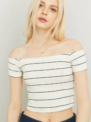 Crop-top crème en maille côtelé à rayures noires, manches courtes et encolure Bardot de Urban Outfitters