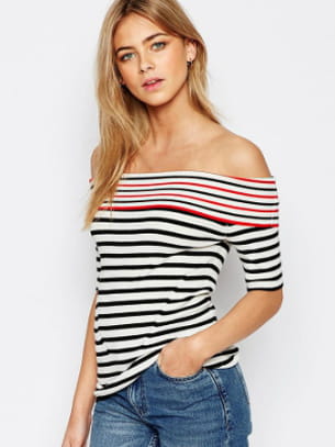 Top blanc en maille douce avec rayures noire et rouge et encolure Bardot de Oasis sur Asos