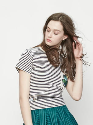 Top blanc en coton à rayures noires avec écusson brodé multicolore sur la poche poitrine de Maje