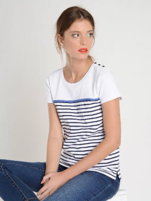 Top blanc en coton avec rayures bleu marine et bleu ciel et boutonnières sur l'épaule de Burton
