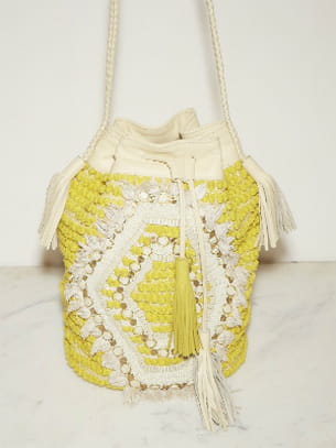 Sac à main porté bandoulière forme bourse jaune et blanc brodé avec pompons de Antik Batik