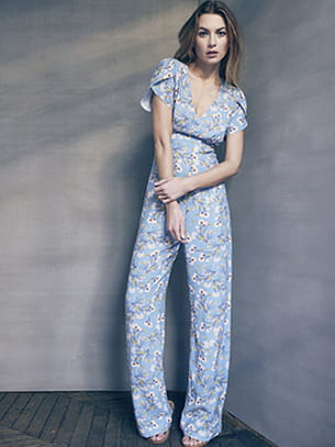 L'imprimé japonisant des fleurs de cerisiers s'invite sur cette sublime combinaison, bleu pastel, à l'allure retro. Petite détail : la fermeture goutte d'eau dans le dos. L'essayer c'est l'adopter !