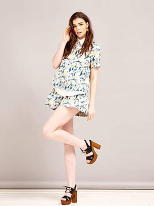 Top et short imprimés de fleurs jaunes et bleues portés sur une chemise blanche avec des sabots chez Sister Jane