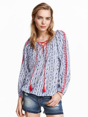 Blouse manches longues raglan  en coton tissé avec détails brodés et laçage au niveau de l'encolure de H&M