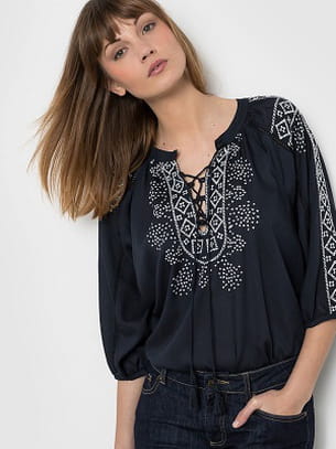 Blouse bleue marine à manches ¾ bouffantes et encolure brodée de motifs ethniques couleur ivoire de La Redoute