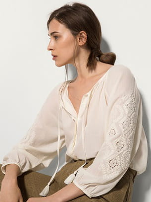 Chemise coupe droite et fluide en pur coton brodé à manches ballons et col rond orné d'un ruban à pompons de Massimo Dutti