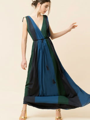 Robe multicolore avec bretelles larges, encolure en V devant et au dos et ceinture et épaules ornées de pompons de Üterque