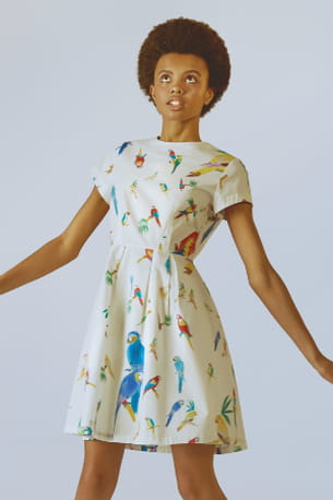 Robe patineuse imprimée oiseaux multicolore et écrue de G.Kero