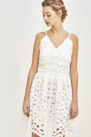 Robe patineuse courte à bretelles en guipure blanche de Brigitte Bardot