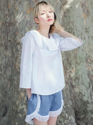 Blouse blanche en coton avec volants et short en chambray avec franges de Blondifox