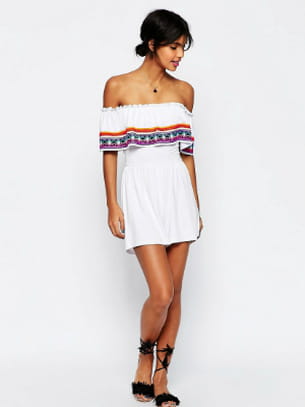 Combinaison short blanche avec broderie multicolore et volants sur le bustier et sandales noires en daim à franges et lacets de Asos