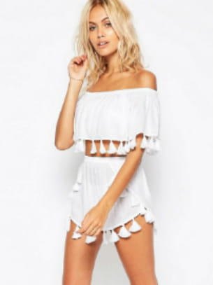 ​​​​​Top blanc et court à encolure bandeau avec des pompons et des franges et short blanc accordé de Asos