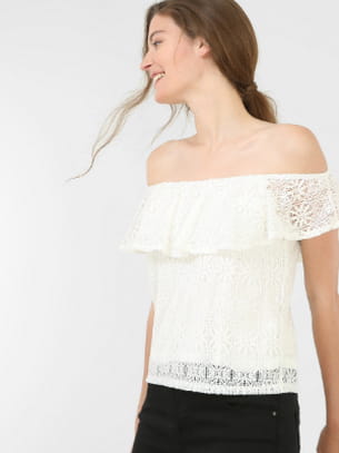 Top blanc en dentelle avec volants sur l'encolure dénudée de Pimkie