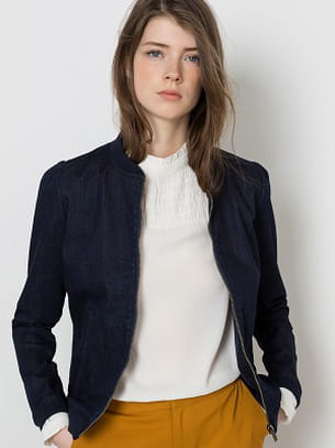 Blouson bomber en jean à têtes de manches froncées et finitions bords côtes de La Redoute
