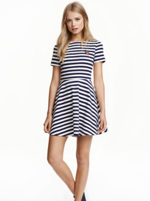 Robe en jersey à rayures bleues et blanches avec fraise sur le côté de la poitrine de H&M