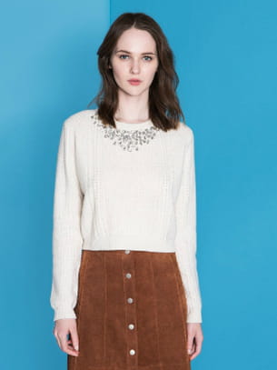 Pull-over blanc en laine avec encolure rebrodée de petits bijoux de Suncoo