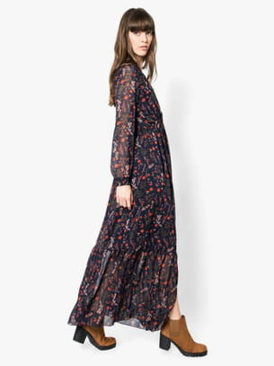 Robe longue et fluide bleu marine avec imprimé floral et boots camel en suédine de Gémo