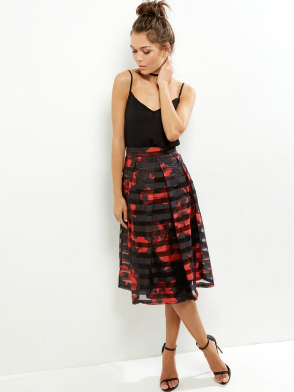 Caraco noir satiné, jupe en tulle noire à  imprimé floral rouge, sandales noires à bride et choker noir en tissu de New Look