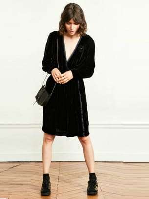 Robe portefeuille en velours noir baskets en cuir imprimé léopard et sac noir en cuir à bandoulière de Swildens