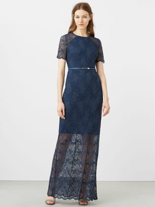 Robe longue bleue en guipure et sandales grises à talons fin de Mango