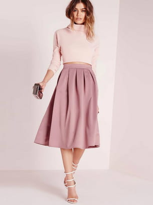 Crop-top rose à col cheminée, jupe midi en satin mauve, sandales ouvertes à brides et pochette rigide métallique de Missguided