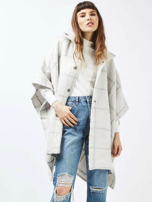 Manteau forme cape boutonnée col montant crème à larges carreaux gris clairs de Topshop